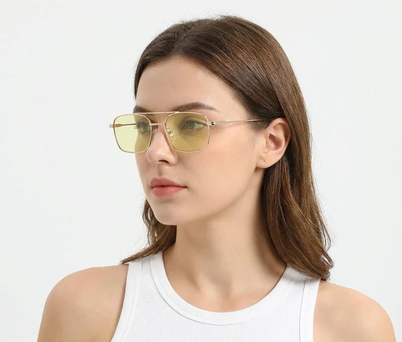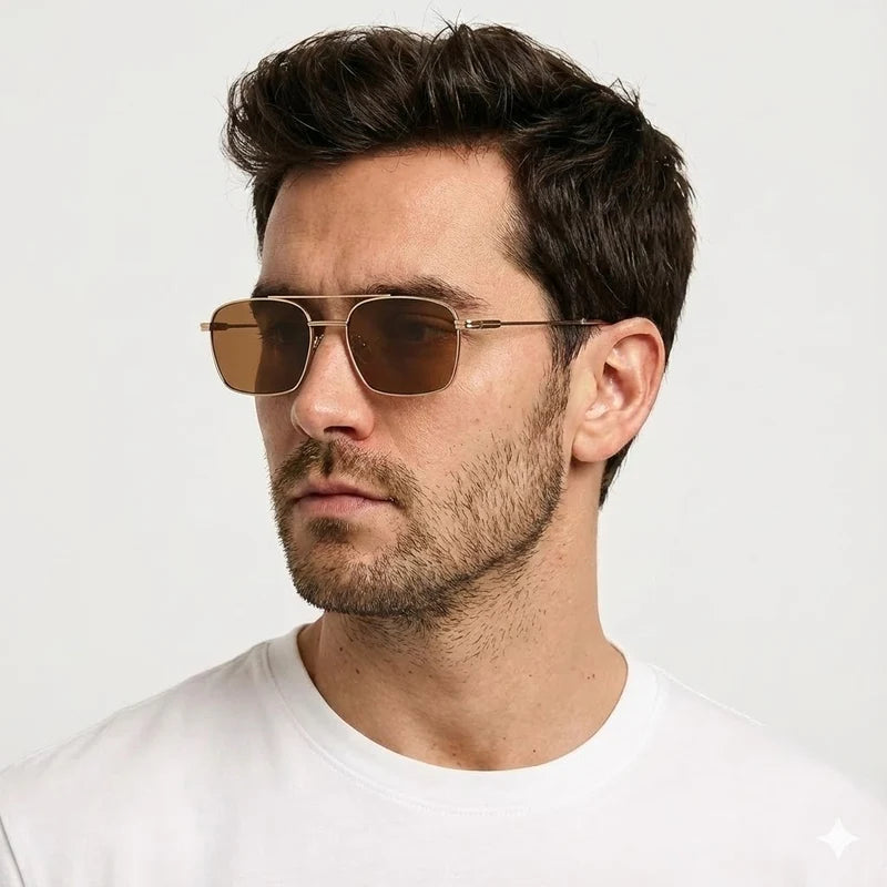 Un chef-d'œuvre de design contemporain qui défie les conventions. Sa structure à double cadre imbriqué joue sur les volumes et les contrastes, mariant des lignes dorées biseautées à des verres profonds. C'est l'accessoire ultime pour ceux qui voient la mode comme une forme d'architecture d'avant-garde.